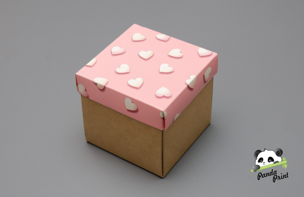 Коробка 100х100х95 3D сердечки белые на розовом (крафт дно)
