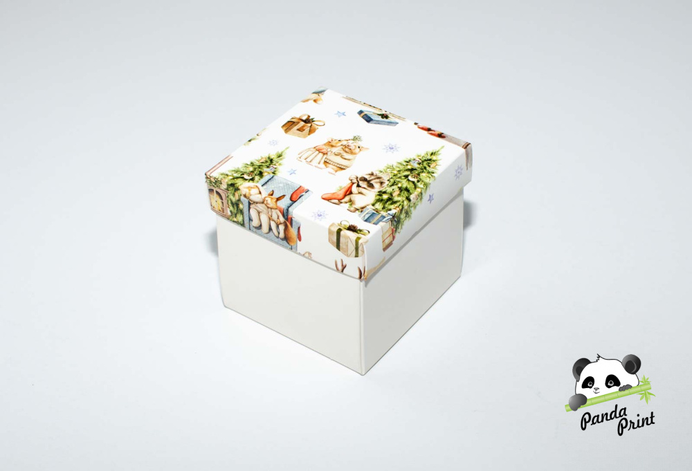 Коробка 100х100х95 Новогодний камин с зверятами (белое дно)