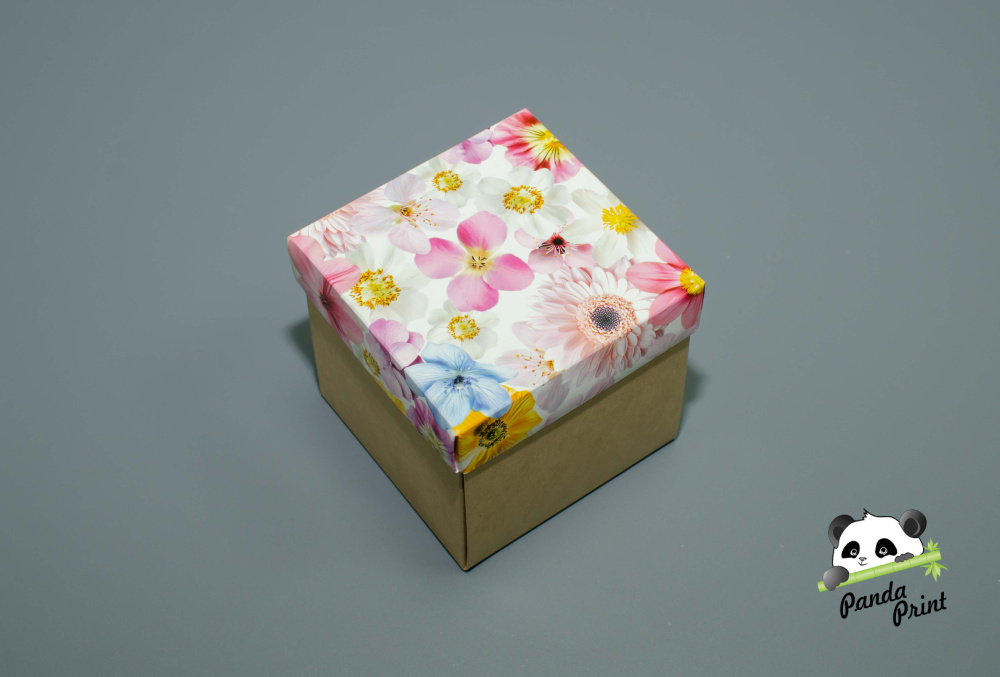 Коробка 100х100х95 Разноцветные цветы (крафт дно)