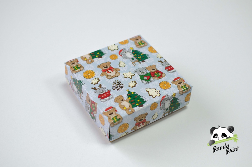 Коробка 120х120х40 Новогодние мишки на голубом фоне (белое дно)