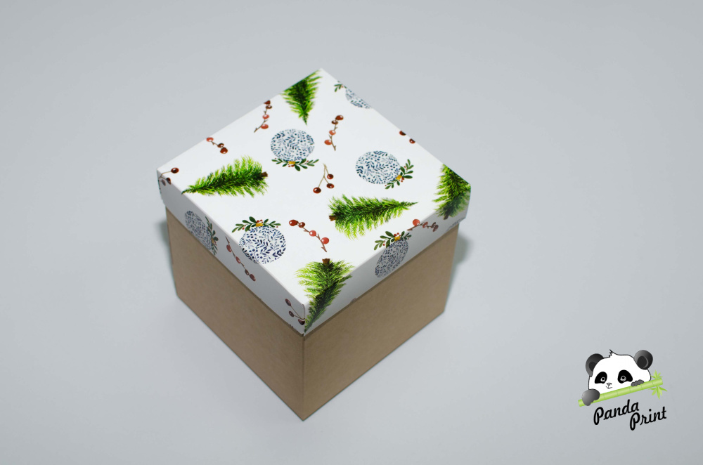 Коробка изготовлена из крафт картона. Крышка с цветным рисунком, дно коробки крафт цвета.