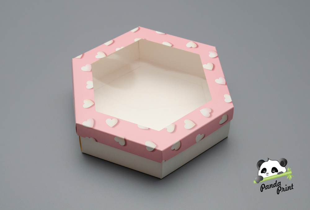 Коробка с прозрачным окном 200х200х60 шестигранная 3D сердечки белые на розовом (белое дно)