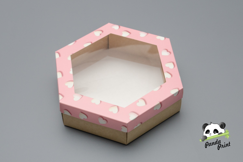 Коробка с прозрачным окном 200х200х60 шестигранная 3D сердечки белые на розовом (крафт дно)