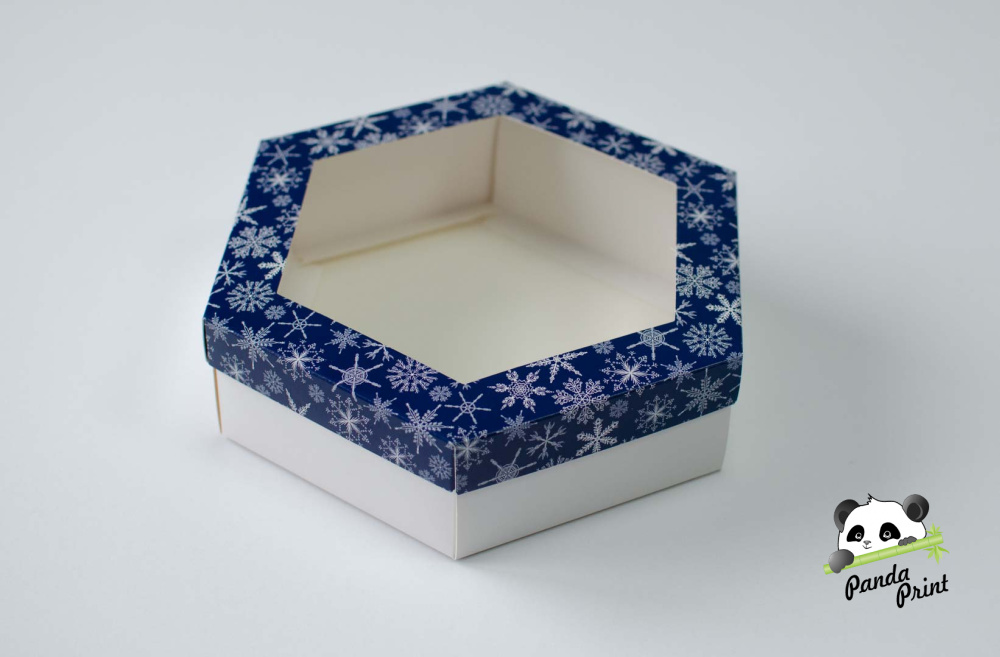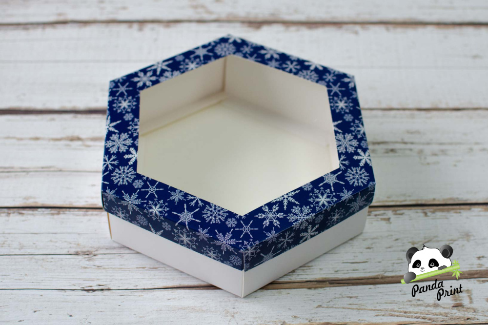 Коробка с прозрачным окном 200х200х60 шестигранная Снежинки белые на синем фоне (белое дно)