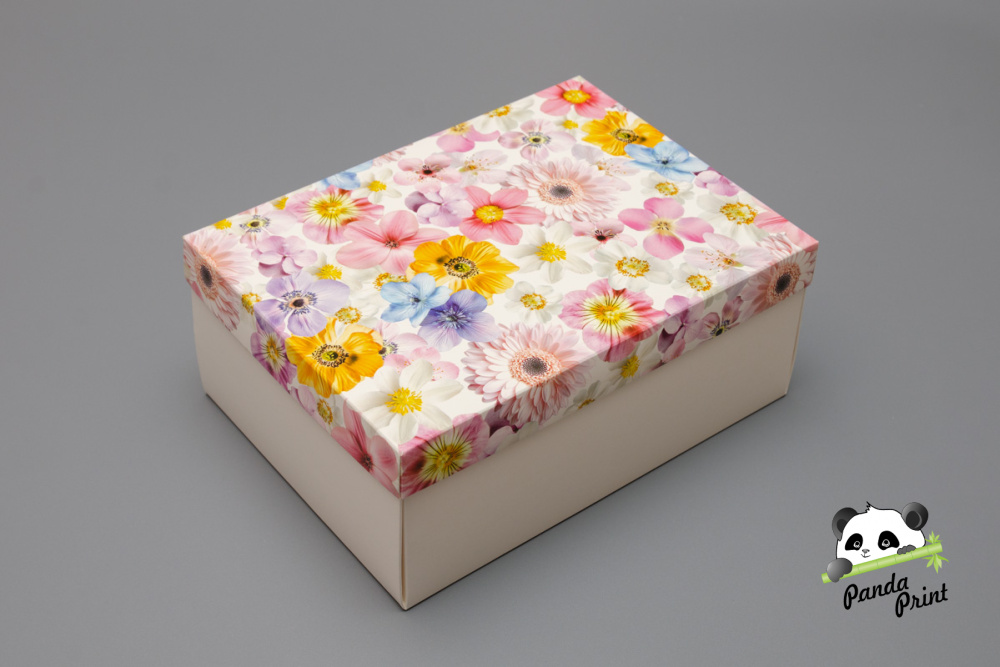 Коробка 220х160х90 Разноцветные цветы (белое дно)