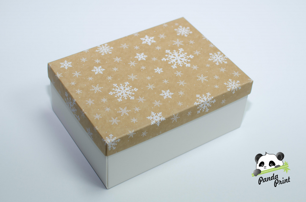 Коробка 220х160х90 Снежинки белые на крафте (белое дно)