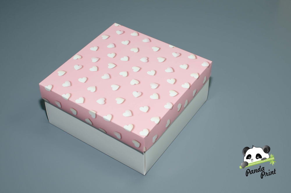 Коробка 220х220х100 3D сердечки белые на розовом (белое дно)