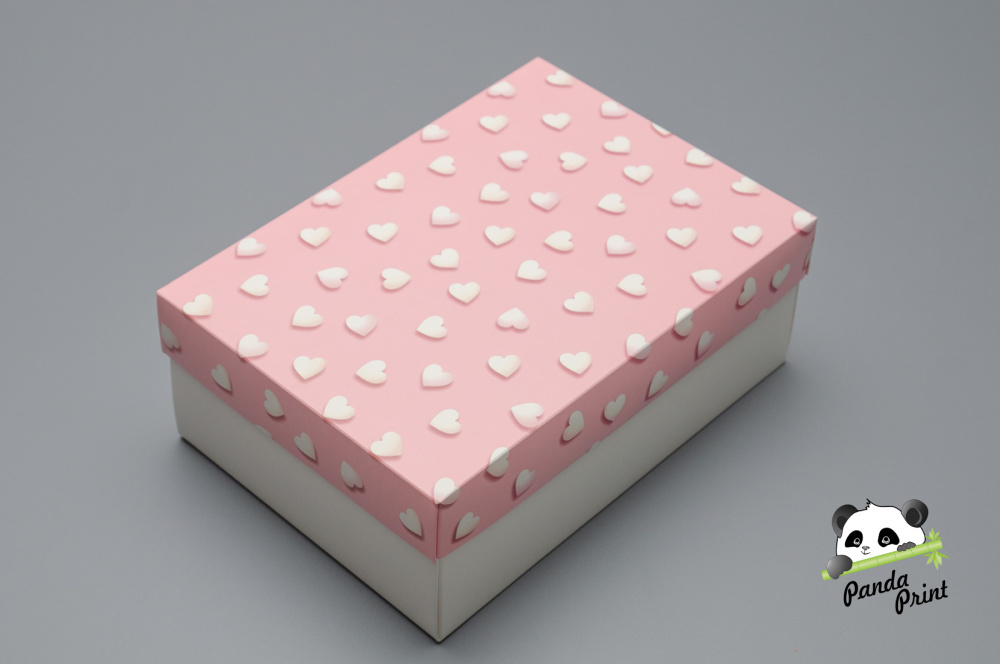 Коробка 270х190х100 3D сердечки белые на розовом (белое дно)