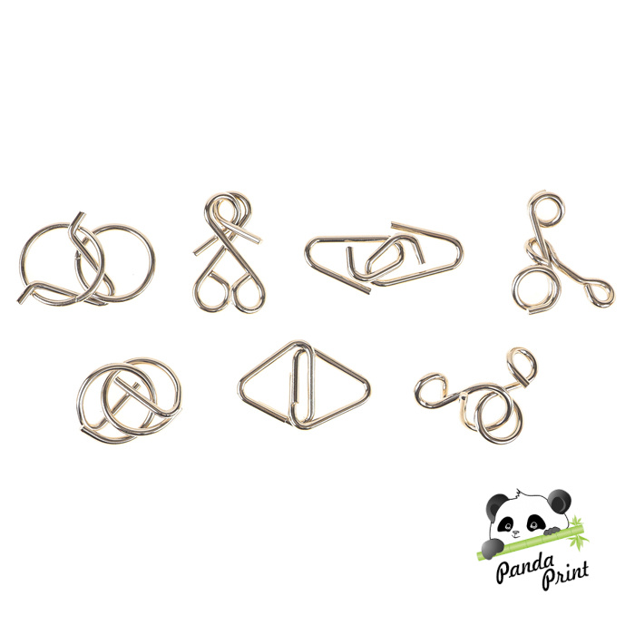 В комплект входят: 7 головоломок, металлические детали.