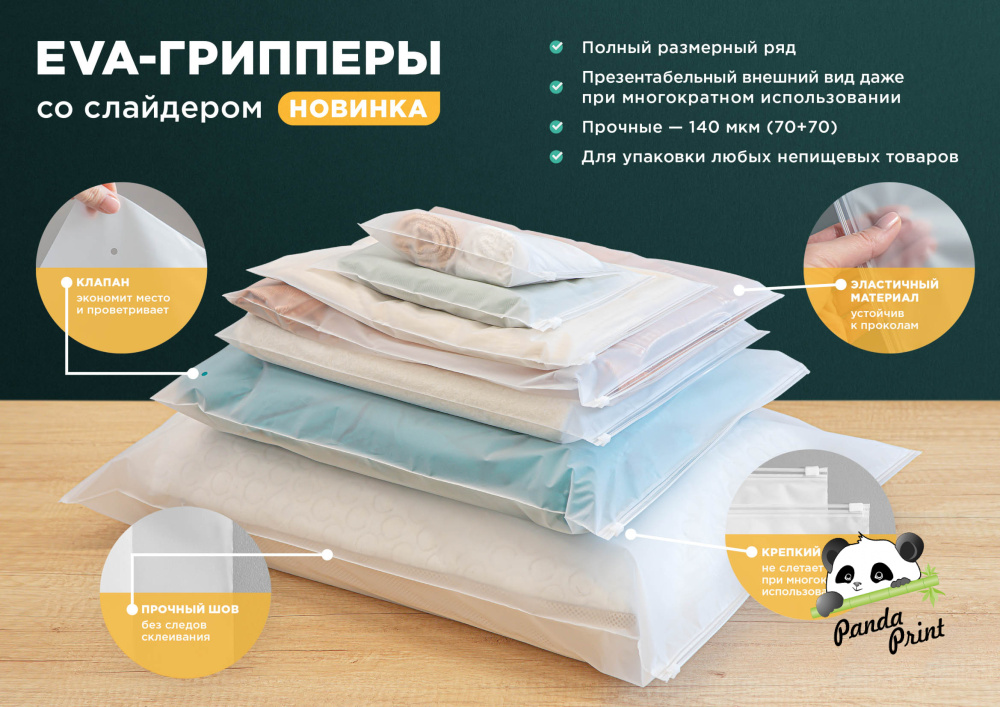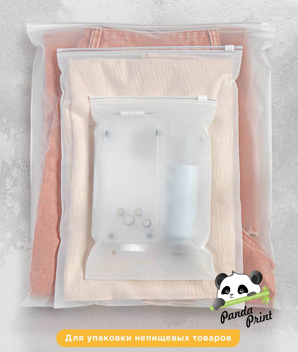 Пакеты многоразовые, мягкий на ощупь, есть два отверстия в нижней части пакета, что позволяет сократить объем упаковки. Бегунок плотно застегивает пакет, поэтому его можно использовать для хранения одежды и ли отправки на маркетплейсах.