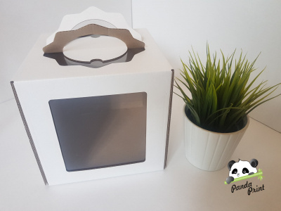 Коробка с прозрачным панорамным окном и ручкой изготовлена из картона, внутренний слой серый, сверху белый. Коробка самосборная, продается в разложенном виде.