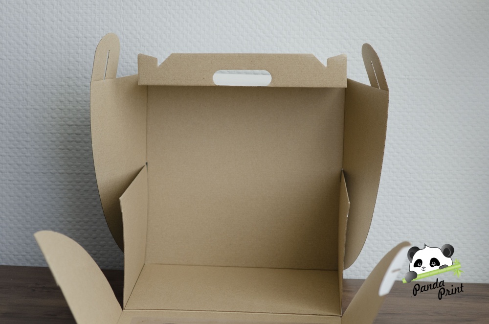 Коробка с прозрачным окном и ручкой изготовлена из картона, внутренний слой бежевый, сверху белый. Коробка самосборная, продается в разложенном виде.