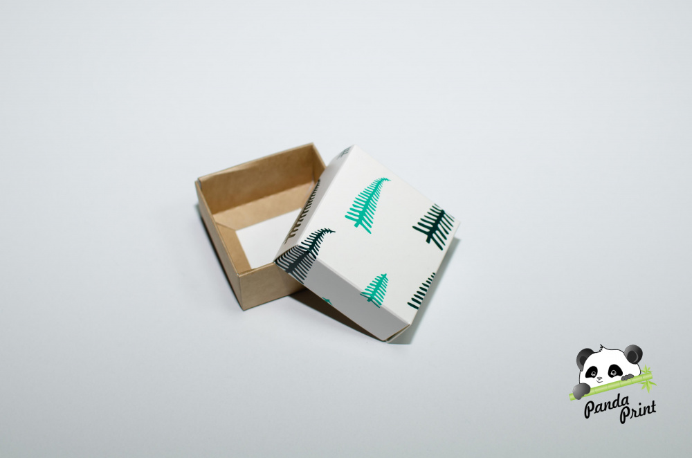 Коробка изготовлена из крафт картона. Крышка с цветным рисунком, дно коробки крафт цвета.