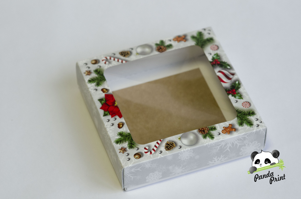 Коробка с прозрачным окном 100х100х30 Новогодняя (крафт дно)