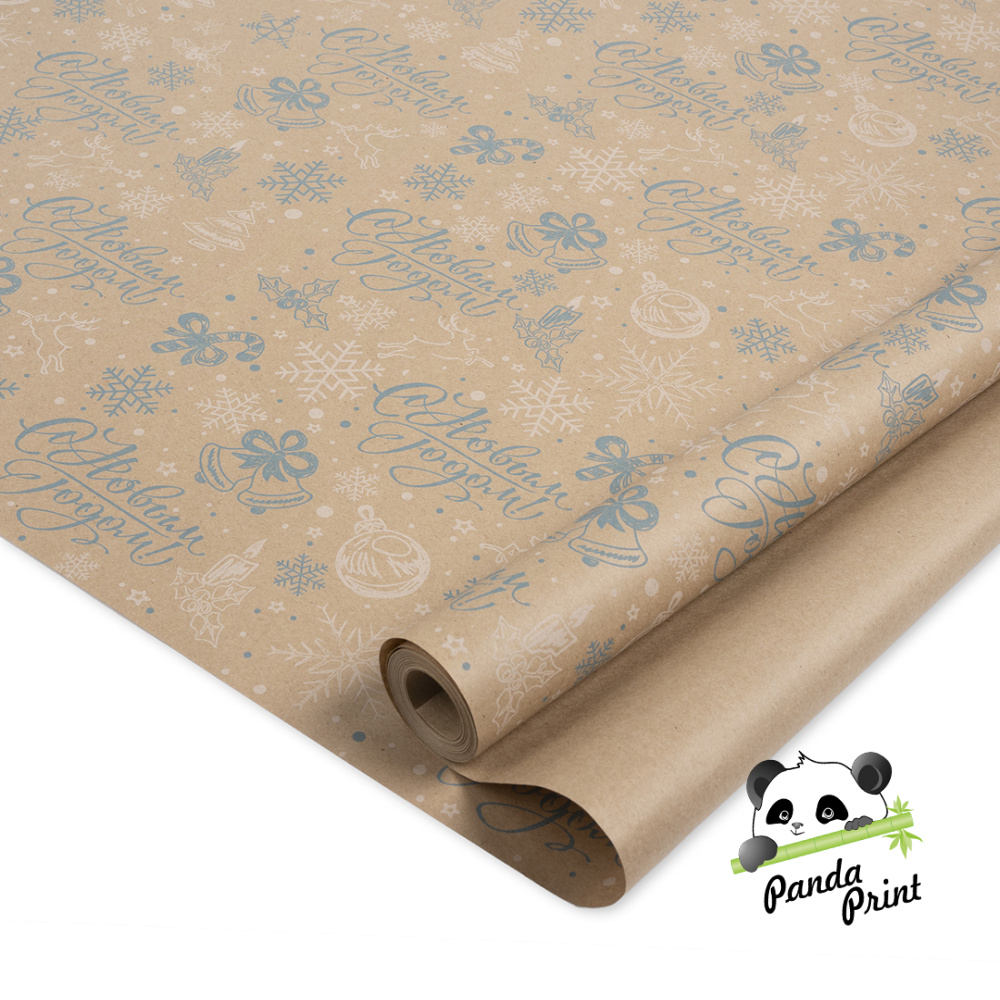 Упаковочная бумага Крафт 60 гр С Новым Годом! голубой/белый (0,7х9,14 м)