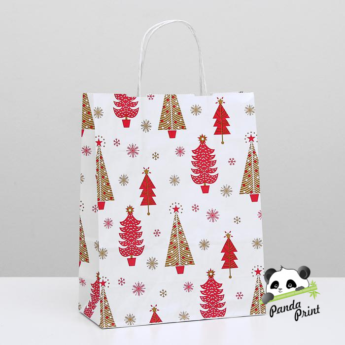 Крафт-пакет с кр.ручкой 250х110х320 Волшебный лес (елочки красно-золотые)