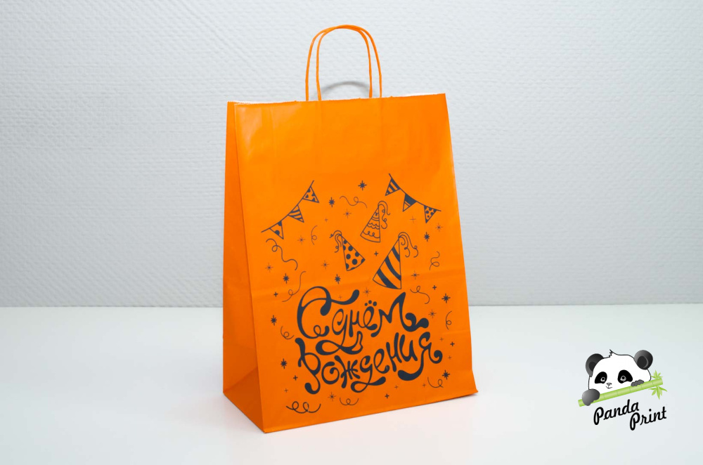 Крафт-пакет с кр.ручкой 260х150х350 С Днем Рождения (колпаки), оранжевый + графитовый