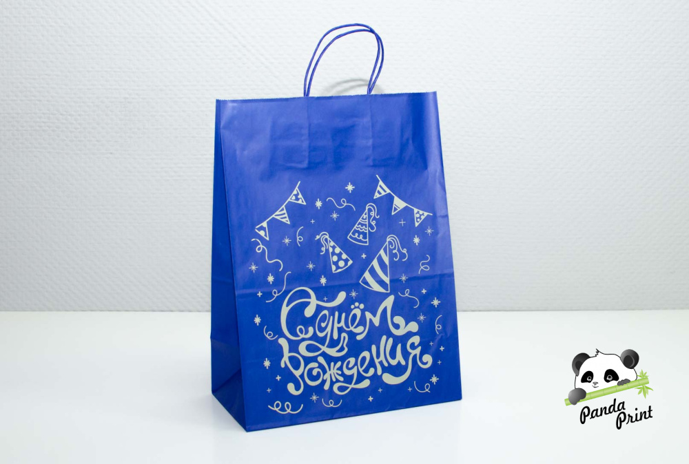 Крафт-пакет с кр.ручкой 260х150х350 С Днем Рождения (колпаки), синий + ванильный
