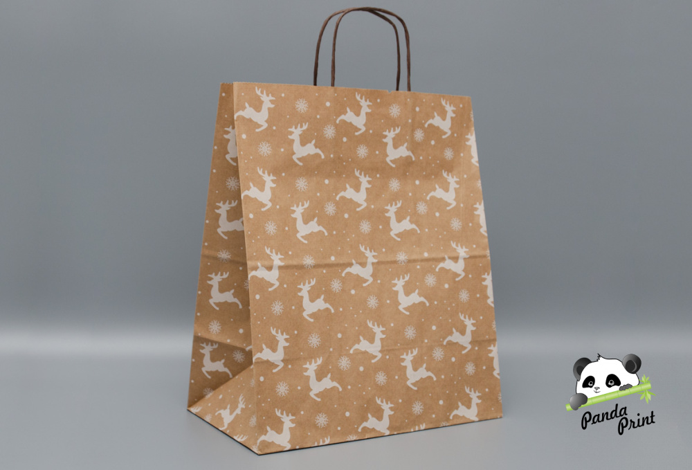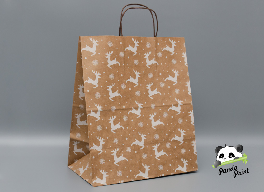 Крафт-пакет с кр.ручкой 320х170х390 Олени белые на крафте (коричневые ручки)