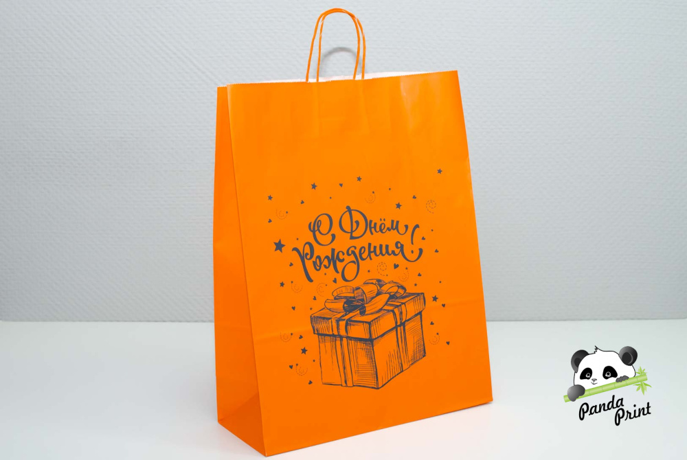 Крафт-пакет с кр.ручкой 350х150х450 С Днем Рождения (подарок), оранжевый + графитовый