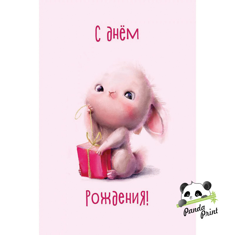 Открытка 100х150 мм (0023) С Днем Рождения! (зайка с подарком), розовый