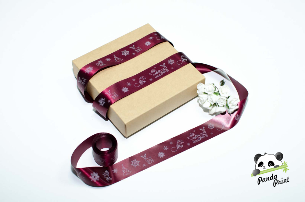 Сатиновая лента с с новогодним рисунком 30 мм х 5 м. Ленту используют для украшения подарков, коробок, букетов.