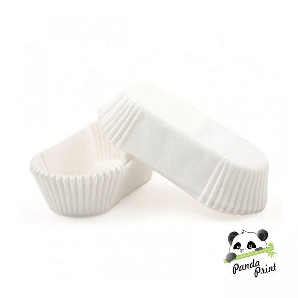 Тарталетки бумажные белые в форме овала. У основания 50 мм, ширина дна 25 мм, высота 20 мм.