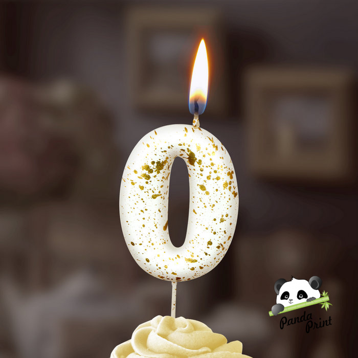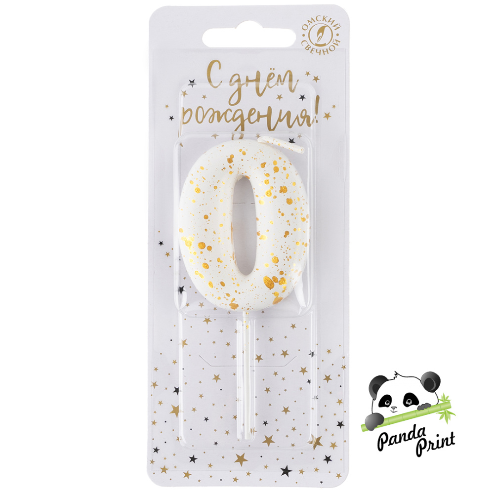 Свеча Цифра 0, Золотые брызги, на шпажке, белый, металлик, 4,3+5,2 см
