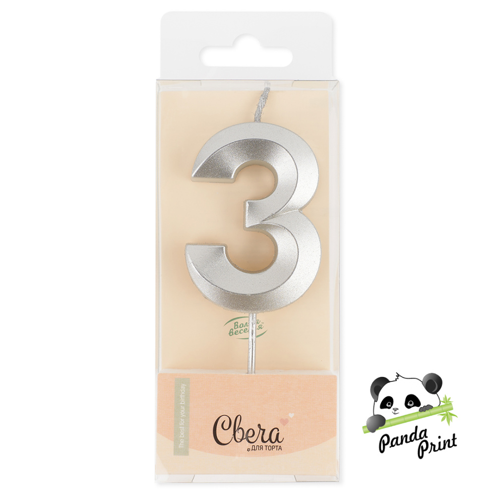 Свеча Цифра 3, Грани, серебро, металлик, 4,2х6 + 4,5 см