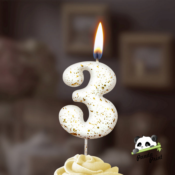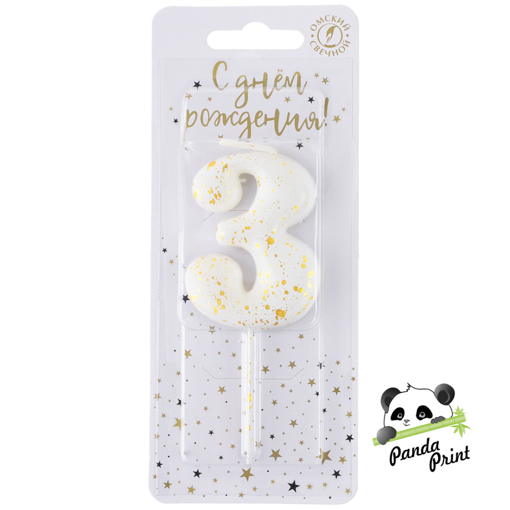 Свеча Цифра 3, Золотые брызги, на шпажке, белый, металлик, 4,3+5,2 см